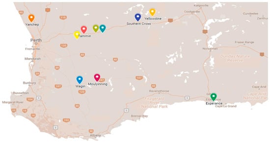 Ticks (n = 192) screened in this study were collected from shingleback skinks (Tiliqua rugosa) captured in October 2016 from various locations extending up to approximately 700 km west and south from Perth in the southwest corner of the Australian continent (Figure 3). Ticks were sent to the Australian Rickettsial Reference Laboratory (ARRL) for further examination. Sampled ticks were then morphologically identified according to previously published tick identification keys [27,28].