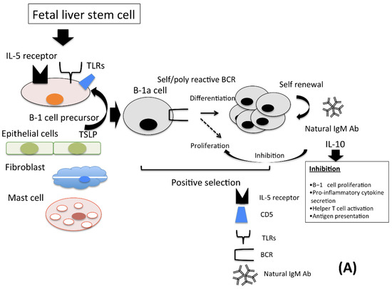 Despite the environmental factors and thymic stromal lymphopoietin (TSLP) and signals from IL-5 receptors, TLRs plays an important role in prolonging B-1 cell survival, and those cells expressing BCR with affinity for antigen are Scheme 1. Cells are classified into two types, namely, B-1a and B-1b. (A). The B-1a cell precursor develops from the liver fetal stem cell, and B-1a cell-derived antibody-producing cells produce natural IgM antibodies, which react to environmental antigens in a polyclonal manner, and anti-inflammatory cytokine IL-10. (B). The B-1b cell precursor develops from the liver fetal stem cell during the fetal period, and from bone marrow in adult. B-1b cell-derived antibody-producing cells produce antigen specific IgM and IgG3, IgA anTable 10. Tool-like receptors, TLRs; thymic stromal lymphopoietin, TSLP; T cell independent antigen, B cell receptor, BCR; T cell independent, TI; antibody, Ab.