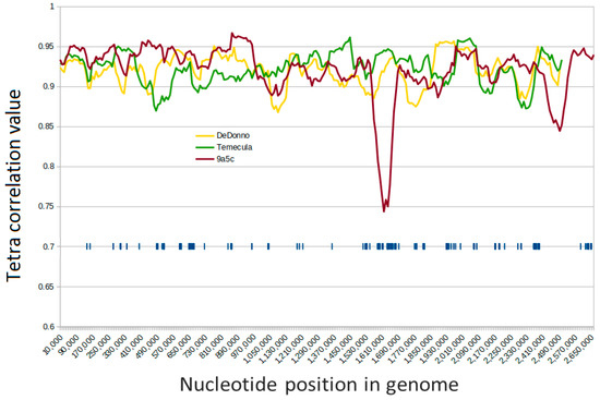 The sliding window plot of tetra correlation values was built using an ad hoc script that calculate tetra z-scores according to [65], and used a window size of 100,000 nts, increasing the positions for calculation by 10,000 nts for each plotted point.