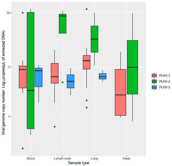 PLHVs were detected in all considered sample types except for PLHV-3, which was not detected in nasal swabs. PLHV-1 was found at a significantly higher frequency in lymph nodes and at a lower one in blood samples (p < 0.001). However, a higher genome copy number/DNA µL was also identified in blood and lungs compared to lymph nodes (Figure 1). A deviation from what expected by chance alone was observed for PLHV-2 also (p = 0.047), for which a trend toward a higher frequency in lymph nodes and blood was present.