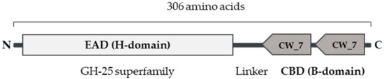 Bacteriophage-encoded peptidoglycan hydrolases—also called endolysins or “enzybiotics”—are a promising alternative to antibiotics [34,35]. Produced towards the end of the lytic cycle in phage-infected bacteria, these enzymes cleave peptidoglycan in the bacterial cell wall, thus lysing the cells and releasing the progeny phages. They have been shown to be particularly effective against Gram-positive bacteria, which lack the Gram-negative outer membrane that might limit accessibility to the cell wall peptidoglycan. Endolysins have several advantages over antibiotics; not least, their very narrow host spectrum, which is usually limited to a single genus or even a single species [36], and their low propensity to generate resistance in their hosts [37]. Bacteriophages that invade Gram-positive bacteria encode a variety of highly diverse endolysins. In general, they have a modular structure consisting of one or more enzymatically active domains (EADs) connected by a flexible interdomain linker to at least one cell wall-binding domain (CBD), typically located at the C-terminus of the protein. Both domains can contribute to the specificity for a given genus or species of bacteria [38].