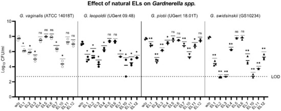 Wild-type endolysins are highly active against four different Gardnerella species. Suspensions of G. vaginalis (ATCC 14018T), G. leopoldii (UGent 09.48), G. piotii (UGent 18.01T), and G. swidsinskii (GS10234) were treated with recombinant endolysins prepared by expression of the naturally occurring genes (EL1–EL7 and EL10–EL12) (see Methods) and the log10 reduction in viable CFU/mL was determined. The log10 reduction was calculated by comparing the CFU/mL after endolysin treatment with that of the buffer control (w/o). LOD indicates the limit of detection. p-values were calculated by one-way ANOVA with multiple comparison to the buffer treated control (w/o) on log-normalized data. * p ≤ 0.05; ** p ≤ 0.01; ns, not significant.
