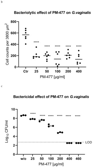 We compared the bactericidal and bacteriolytic effects of PM-477 on G. vaginalis and G. swidsinskii by treating suspensions of the bacteria with 25–400 µg/mL PM-477 for 5 h and then counting the cell numbers by microscopy and determining their viability by quantitative plating (Figure 4b–e). The highest concentration of PM-477 (400 µg/mL) decreased the number of cell-like structures by only 80–90% (Figure 4b,c), whereas the same treatment resulted in a ≥ 5.6 log10 reduction in viable cells. This indicates that PM-477 may kill before fully dissolving bacterial cells, resulting in visible but dead cell-like structures seen under the microscope (Figure 4d,e).