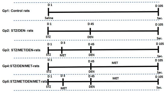 Experimental design showing the different groups under the study with time course injections of streptozotocin (STZ), diethylnitrosamine (DEN) and metformin (MET). Gp1: received only saline. Gp2 (STZ/DEN): injected intraperitoneally (i.p.) with a single dose of STZ (80 mg/kg) and after 45 days were injected i.p with DEN (50 mg/kg). Gp3 (STZ/MET/DEN): injected i.p with STZ, 3 days later rats were treated by gavage with 150 mg/kg of MET each other day for 102 days, then at day 45 rats were injected with DEN once weekly. Gp4 (STZ/DEN/MET): injected i.p with STZ, 45 days later DEN was injected once per week and rats were treated by gavage with 150 mg/kg of MET. Gp5 (STZ/MET/DEN/MET): injected i.p. with STZ, 3 days later injected with MET, 45 days later both DEN and MET treatment started.