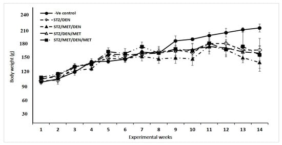 Body weight changes over 14 weeks of treatments with STZ, DEN, MET, or their combinations, according to the experimental design.
