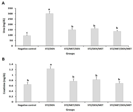 Levels of the urea (A) and creatinine (B) in the different groups under study. The results are means of seven rats per group under different treatment conditions as indicated in the experimental design section. Bars represent standard deviation. Columns with different lower-case letters indicate a significant difference between all the studied groups at p < 0.05 (Tukey’s test).
