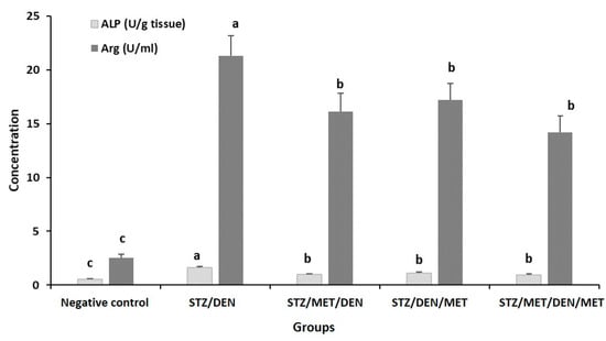 Levels of alkaline phosphatase (ALP) and arginase (Arg) activities in the sera of the different groups under study. The results are means of seven rats per group under different treatment conditions as indicated in the experimental design section. Bars represent standard deviation. Columns with different lower-case letters indicate a significant difference between all the studied groups at p < 0.05 (Tukey’s test).