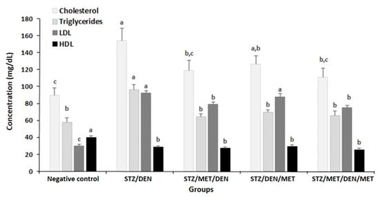 The concentrations of cholesterol, triglycerides, low-density lipoprotein cholesterol (LDL), and high-density lipoprotein cholesterol (HDL) in the sera of the different groups under study. The results are means of seven rats per group under different treatment conditions as indicated in the experimental design section. Bars represent standard deviation. Columns with different lower-case letters indicate a significant difference between all the studied groups at p < 0.05 (Tukey’s test).