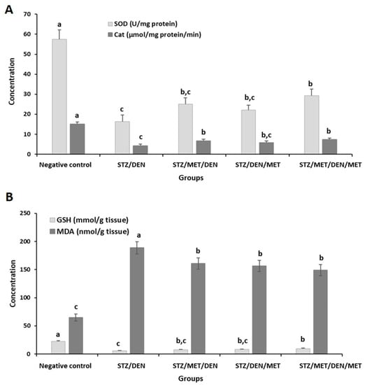 Furthermore, in this group, there was an elevation in MDA levels that was associated with decreases in SOD, CAT, and GSH levels. Treatment with MET before or after induction of HCC increased the previously ameliorated oxidative stress parameters; however, the maximum improvement was found in the group of rats treated with MET before and after HCC induction (Gp5) which showed the lowest increase in MDA levels and the lowest decrease in SOD, CAT, and GSH levels, when compared to other groups (Figure 6).