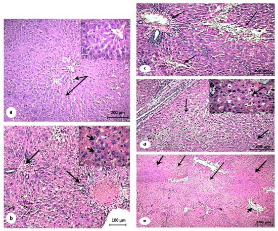 The control untreated tissue sections revealed the liver tissue, which consists of many anastomosing strands of hepatocytes. The hepatocytes appeared as polyhedral cells with acidophilic cytoplasm and rounded central vesicular nuclei. The blood sinusoids showed interlobular spaces surrounding the central vein (Figure 7a). Treatment with STZ for 45 days followed by DEN for 60 days increased the inflammation of the hepatic tissue and resulted in induction of the primary liver cirrhosis. The portal veins markedly enlarged and were surrounded by peripheral loose connective tissues. Additionally, many populations of small lymphocytes and inflammatory cells appeared; the hepatocytes eroded, as exhibited by the piecemeal necrosis of some hepatocytes (Figure 7b). The apparent disappearance of the hepatic cirrhosis revealed in all STZ/MET/DEN, STZ/DEN/MET, and STZ/MET/DEN/MET treated groups (Gp3, Gp4, and Gp5, respectively). STZ/MET/DEN treated group showed cellular infiltration at the portal tracts, marked appearance of marginal loose connective tissues at the central veins, and disappearance of the malignant cells. In STZ/DEN/MET treated animal group (Gp4) showed apparent severe necrosis of hepatocytes with marked pyknotic nuclei at particular sites, while many sites demonstrated more or less normal hepatocytes with profound degenerative changes (Figure 7c,d). Hepatic tissue regained more or less the normal architecture of hepatocytes and lobules in STZ/MET/DEN/MET treated group (Gp5), in which it was recorded that the hepatic lobulation exhibited significant improvement accompanied with mild infiltration at the portal veins (Figure 7e).
