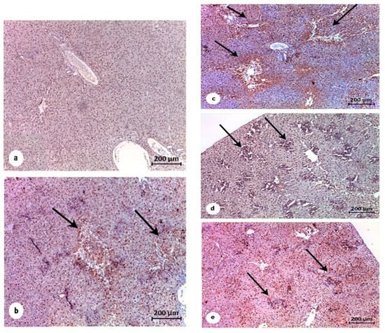 The activity of caspase-3 marker for apoptotic cells was examined as an immunolabelling marker for the hepatic tissues. The non-treated control group (Gp1) showed negative expression (Figure 9a). Treated group Gp4 showed reduced expression of caspase-3 activity in the hepatic tissues as many scattered patches were noticed (Figure 9d) while treated groups Gp3 and Gp5 demonstrated apparent improvement and reduction of the immunoexpressed cells with caspase-3 antibodies marker (Figure 9c,e) that appeared concentrated at the central and portal veins of Gp2 (Figure 9b).