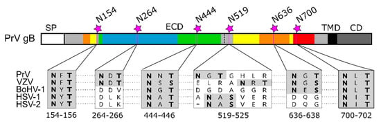 - Vallbracht, M.; Rehwaldt, S.; Klupp, B.G.; Mettenleiter, T.C.; Fuchs, W. Functional Role of N-Linked Glycosylation in Pseudorabies Virus Glycoprotein Gh. J. Virol. 2018, 92, e00084-18. [Google Scholar] [CrossRef]