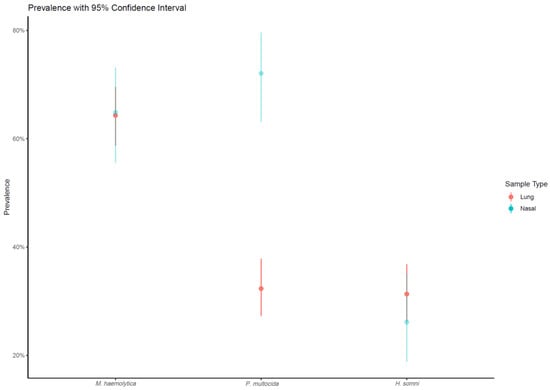 BRD pathogen detection. Along with the sample distribution, Table 2 shows the prevalence of BRD pathogens by sample type. In addition to the individual BRD pathogens examined in this study, a new pathogen category, “positive for at least one BRD pathogen”, was evaluated. Overall, of the submitted samples for BRD diagnosis, at least one BRD pathogen was detected in 97.8%. In general, the prevalence of samples with at least one BRD pathogen was higher for lung samples (99.7%) than nasal samples (97.3%). Consistent with previous reports, M. haemolytica was the most frequently isolated BRD pathogen, comprising 63.7% of tested samples, followed by P. multocida (42.5%) and H. somni (29.6%). However, the pathogen distribution varied by sample type (Figure 1). Specifically, among lung samples, M. haemolytica was the most prevalent pathogen (64.3%), followed by P. multocida and H. somni at similar levels (32.3% and 31.3%). By contrast, both M. haemolytica and P. multocida were relatively highly prevalent in nasal samples (64.9% and 72.1%), whereas H. somni was not (26.1%).