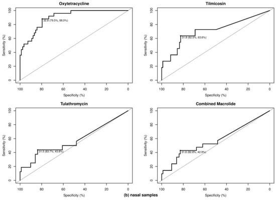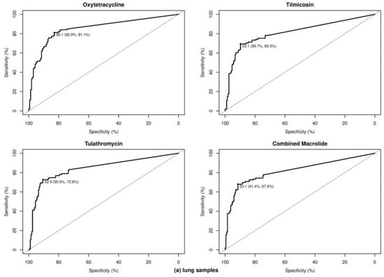 Receiver operating characteristic curves for determining optimal cycle threshold (Ct) cutoff values for lung samples (a) and nasal samples (b). Determined optimal Ct cutoff values with corresponding sensitivity and specificity were provided for predicting the presence of bovine respiratory disease pathogens resistant to tetracycline and macrolide drugs, respectively. Combined macrolide refers to resistance to either tilmicosin or tulathromycin.
