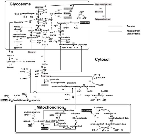 Our genome analyses of V. ingenoplastis have confirmed the presence of most of the enzymes of carbohydrate metabolism, necessary for the production of all the major end-products under aerobic and anaerobic conditions [13] (Figure 1). Both Phytomonas spp. and V. ingenoplastis resemble each other in that they metabolize glucose to acetate, succinate and ethanol in varying amounts, depending on the oxygen availability. Ethanol production can be facilitated by isopropanol dehydrogenase (uniquely present in these species) converting acetaldehyde into ethanol [33,52]. However, Phytomonas and Vickermania differ in that Phytomonas excretes pyruvate and glycerol [53], similar to the bloodstream form of the African trypanosomes. In these species, glycerol is produced in the reversal of the glycerol kinase reaction via highly active glycosomal glycerol kinase [54]. Vickermania ingenoplastis lacks this enzyme (the annotated glycerol kinase is likely a xylulose kinase rather than a glycerol kinase). Instead, it excretes propionate using enzymes of the methylmalonyl-CoA pathway and the propionate cycle, which is absent in Phytomonas spp. (and in most other trypanosomatids).