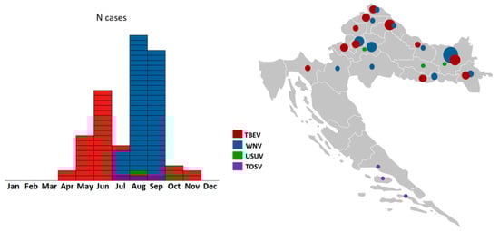 Seasonal (left) and geographic distribution (right) of neuroinvasive arboviral infections in Croatia (2017–2020). Within the arbovirus surveillance program (project CRONEUROARBO), four neuroinvasive arboviruses were detected: TBEV, WNV, USUV, and TOSV. Circle size corresponds to the number of reported human cases.
