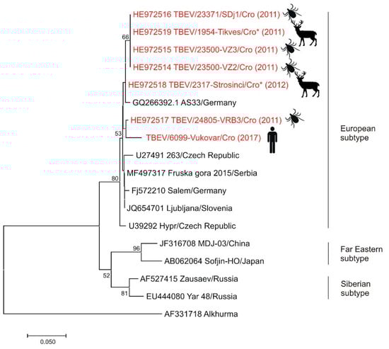 Phylogenetic neighbor-joining analysis of a 174-nucleotide fragment of the TBEV 5′-NTR and partial capsid gene. Strains detected in Croatia are marked in red with year of detection in parentheses and indicated figure of the host. Alkhurma virus was included as an outgroup. GenBank accession number for each isolate used in the analysis is specified. Supporting (≥50%) bootstrap values of 1000 replicates are displayed at the nodes. Horizontal distances are proportional to genetic distance. Scale bar indicates nucleotide substitutions per site.