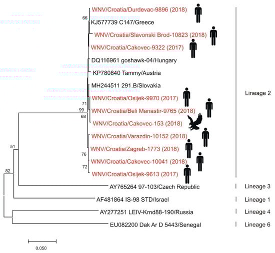 Phylogenetic neighbor-joining analysis of a 848-nucleotide fragment of the WNV NS5 gene. Strains detected in Croatia are marked in red with year of detection in parentheses and indicated figure of the host. GenBank accession numbers for isolates used in the analysis are specified where appropriate. WNV genetic lineages suggested by Rizzoli et al. [] are indicated on the right. Lineages 5 and 7 could not be included in the analysis due to only partial sequence availability. Supporting (≥50%) bootstrap values of 1000 replicates are displayed at the nodes. Horizontal distances are proportional to genetic distance. Scale bar indicates nucleotide substitutions per site.