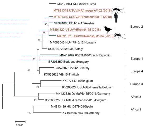 Phylogenetic neighbor-joining analysis of a 543-nucleotide fragment of the USUV NS5 gene. Strains detected in Croatia are marked in red with year of detection in parentheses and indicated figure of the host. GenBank accession number for each isolate used in the analysis is specified. USUV genetic lineages suggested by Cadar et al. [] are indicated on the right. The highly divergent Africa 1 genetic lineage was not included in the analysis in order to increase the resolution of the phylogram. Supporting (≥50%) bootstrap values of 1000 replicates are displayed at the nodes. Horizontal distances are proportional to genetic distance. Scale bar indicates nucleotide substitutions per site.