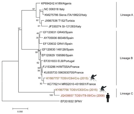 Although high seroprevalence rates for TOSV were detected among residents of the Croatian littoral, TOSV is still a neglected virus in Croatia with only a few documented cases of human neuroinvasive infection. In 2007–2008, cerebrospinal fluid and serum samples were collected from 30 hospitalized patients with aseptic meningitis. TOSV IgM antibodies were detected in four patients, while two had detectable TOSV RNA in the CSF. Phylogenetic analysis of partial L and S segments suggests that TOSV from Croatia represented an autochthonous strain []. From 2007 to 2009, a seroprevalence study was conducted. IgG antibodies to TOSV were detected in 37.5% persons: 53.9%, 33.6%, and 6.1% residents of the islands, coastal area, and the mainland of Croatia, respectively. Risk factors significantly associated with TOSV seropositivity were living on islands or in coastal areas and older age. As people from the mainland often travel to the littoral for summer vacations, the possibility of being infected there is not excluded []. In the 2018 and 2019 transmission seasons, three additional cases of neuroinvasive infection were also confirmed serologically at the Croatian littoral []. In 2015, an entomologic study was conducted. A total of 1453 sand flies were collected from five locations in Croatia. Co-circulation of two TOSV lineages (B and C) was detected in Phlebotomus neglectus sandfly pools (Figure 5) []. Since TOSV testing is not a part of routine diagnostic algorithms, the true prevalence of the disease is unknown.