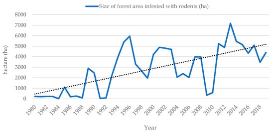 From 1980 to 2016, monitoring consisted of recording infested forest areas (ha) with noticeable rodent damage (on stem and roots of forest tree saplings). In 2017, monitoring got improved by Integrated Pest Management (IPM) principles [,], so now it involves sampling rodents by using snap traps on line-transects [] and also identifying relative share of damaged forest seeds and seedlings primary at young regeneration forest stands. Results of such monitoring are being entered and processed through online database (https://stetnici.sumins.hr/). Rodent monitoring does not include testing sampled individuals for pathogens.