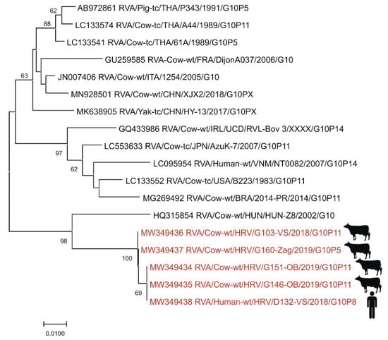 Phylogenetic neighbor-joining analysis of a 286-nucleotide fragment of the VP7 gene of G10 RVA strains. Strains detected in Croatia are marked in red with the indicated figure of the host. GenBank accession number for each isolate used in the analysis is specified. Supporting (≥50%) bootstrap values of 1000 replicates are displayed at the nodes. Horizontal distances are proportional to genetic distance. Scale bar indicates nucleotide substitutions per site.