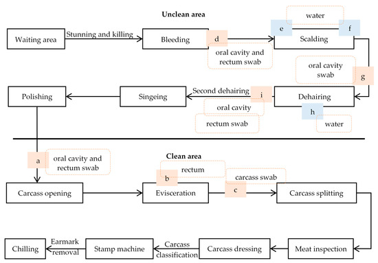 Schematic overview of the slaughter process in the pig slaughterhouse. a–i: sampling points during the different sampling events. Blue boxes refer to water samples, orange boxes refer to samples taken from the carcasses.