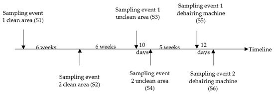 The timeline of the six sampling events (S1 to S6) in the slaughterhouse is given in Figure 2. To identify the main contamination source, four sampling events took place: twice in the clean area, and then twice in the unclean area. Each time, 30 slaughtered pigs were sampled at random with an interval of two minutes between carcasses. The collection of samples began 3–4 h after the start of the day’s slaughter in each case. The origin of each of the 30 carcasses of the pigs was noted. No information on the Salmonella status of the batches to which the sampled pigs belonged, was available. In addition, in a later stage, water samples were taken twice from the dehairing machine. Moreover, water samples were taken once in three other slaughterhouses A, B, C (A, B and C are codes of other different slaughterhouses) and before and during the slaughter activity.