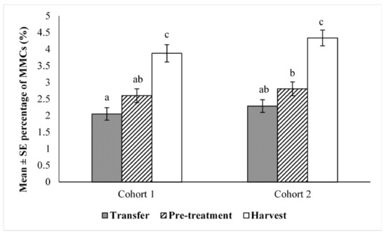 SBT from both cohorts showed the same pattern of changes in the percentage area of the spleen occupied by MMCs (Figure 1). Size of MMCs (expressed as percentage surface area) did not significantly change between transfer and pre-treatment, while it significantly increased at harvest time (p < 0.001). For both cohorts, the size of MMCs at harvest time was about 1.9 × higher than those at transfer time and increased 1.5 times between pre-treatment and harvest time. No significant difference was detected between the two cohorts at any sampling time (Figure 1).