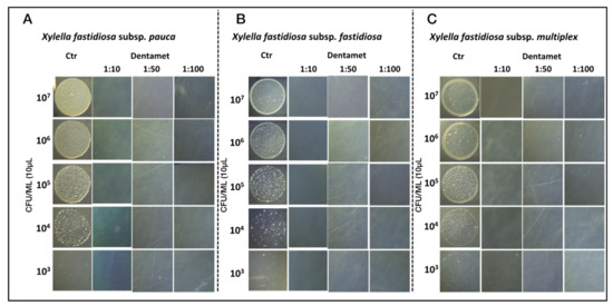 Bacteriostatic/bactericidal evaluation of X. fastidiosa subsp. pauca strain De Donno_CFBP8402 (A), X. fastidiosa subsp. fastidiosa strain Temecula1 (B) and X. fastidiosa subsp. multiplex strain CFBP 8416 (C). Aliquots of 10 µL and ten-fold dilutions from 107 to 103 CFU mL−1 of each X. fastidiosa subspecies were spotted on PD2 agar plates supplemented or not with 1:10, 1:50 and 1:100 Dentamet® dilutions and incubated at 28 °C. Ctr: X. fastidiosa cultures grown on PD2 Dentamet®-free.