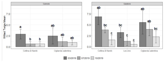 Mean number ± standard error of new wilted twigs on olive trees treated with Dentamet® as assessed on March, July and October 2019 at Cannole (Ogliarola salentina, Cellina di Nardò) and Galatone (Ogliarola salentina, Cellina di Nardò, Leccino) (Lecce province). Statistical significance was assessed through Multiple ANOVA (p-value < 0.05) after having testes the data normality, followed by post-hoc Tukey’s test (alpha = 0.05). Different letters indicate statistical difference between group means according to the Tukey’s test.