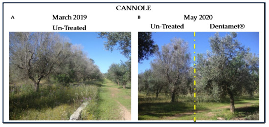 Cannole plot trees. (A) Control untreated trees in Cannole plot as observed in March 2019. The trees appeared severely damaged by X. fastidiosa subsp. pauca. (B) Ogliarola salentina trees treated with Dentamet® (right) and control tree (left) on May 2020, one year after the data samplings.
