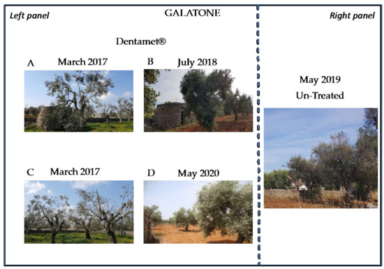 Galatone plot trees. (Left panel) (A) Olive trees of Galatone Plot as appeared in March 2017 just before the starting of the treatments; (B) the same trees in July 2018, 17 months after the starting of the spray treatments with Dentamet®. (C) Ogliarola salentina and Cellina di Nardò trees in Galatone plot as appeared in March 2017 just before the starting of spray treatments; (D) Leccino (foreground) and Cellina di Nardò (background) trees of Galatone plot in May 2020, one year after the present study. (Right panel) Control trees in Galatone plot as observed in March 2019. The trees appeared severely damaged by X. fastidiosa subsp. pauca.