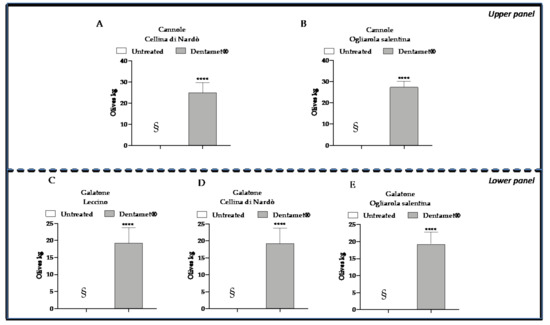 Plant production. Graphical representation of olives production of (A) Cellina di Nardò and (B) Ogliarola salentina at Cannole (upper panel) and (C) Leccino, (D) Cellina di Nardò and (E) Ogliarola salentina in Galatone (Lower panel) expressed as means ± SD of Kg olives per plant. § Un-treated control plants were completely withered during 2019 in Galatone and in Cannole and determined no olives production. A statistically significant difference was obtained between un-treated plants and plants treated with Dentamet®, according to one-sample T-test and Wilcoxon test (**** p ≤ 0.0001 vs. controls (zero olives Kg)).