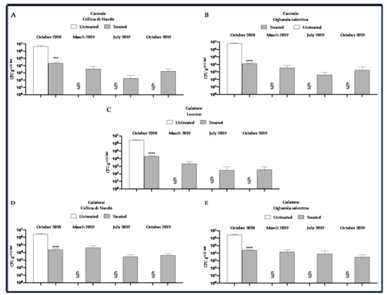 X. fastidiosa subsp. pauca DNA concentration, expressed in CFU equivalents g−1 of leaf, determined for un-treated plant (assessed as time 0 control) and Dentamet®-treated cultivars Cellina di Nardò, Ogliarola salentina, at Cannole and Galatone (assessed in 2019). § Untreated control plants dead in 2019, so the absence of concentration data is indicative of plant death. (A,B) Graphical representation of the bacterial concentration over time of Cellina di Nardò and Ogliarola salentina at Cannole. (C–E) Graphical representation of the bacterial concentration over time of Leccino, Cellina di Nardò and Ogliarola salentina at Galatone. Bacterial concentration is expressed in CFU equivalents g−1 of leaf ((**** p ≤ 0.0001 vs. controls (zero olives Kg), see also Section 4).