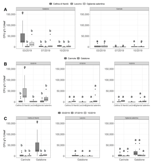 Indeed, the Cellina di Nardò trees sampled in March at Cannole showed a very similar bacterial concentration of Ogliarola salentina (Figure 9B), estimated: 3.6 × 103 ± 6.2 × 103 SD and 3.7 × 103 ± 5.9 × 103 SD CFU g−1 of leaf in Cellina di Nardò and Ogliarola salentina, respectively (Table 1). The p-value from Tukey’s test for this comparison is, in fact, equal to 1, denoting a non-significant difference.