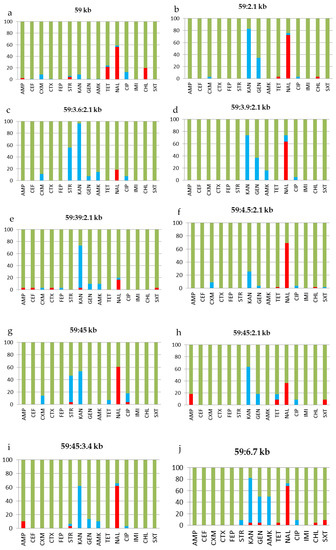 Antibiotic susceptibility of S. Enteritidis strains (n=345) of the top ten plasmid profile types isolated in regions of Siberia and the Far East of Russia: (a) 59 kb, (b) 59:2.1 kb, (c) 59:3.6:2.1 kb, (d) 59:3.9:2.1 kb, (e) 59:39:2.1 kb, (f) 59:4.5:2.1kb, (g) 59:45 kb, (h) 59:45:2.1 kb, (i) 59:45:3.4 kb, and (j) 59:6.7 kb. The Y-axis indicates the percentage of strains susceptible (green), resistant (red), and intermediate (blue) to the given antibiotic. Ampicillin 10 μg (AMP), cephalexin 30 μg (CEF), cefuroxime 30 μg (CXM), cefotaxime 30 μg (CTX), cefepime 30 μg (FEP), streptomycin 10 μg (STR), kanamycin 30 μg (KAN), gentamicin 30 μg (GEN), amikacin 30 μg (AMK), tetracycline 30 μg (TET), nalidixic acid 30 μg (NAL), ciprofloxacin 5 μg (CIP), imipenem 10 μg (IMI), chloramphenicol 30 μg (CHL), and trimethoprim 1.25 μg/sulfamethoxazole 23.75 μg (SXT).