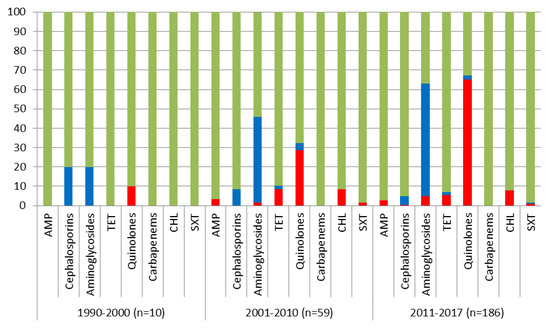 To assess the change in the susceptibility of S. Enteritidis strains over time, they were split into three periods according to decade (period I (1990–2000), period II (2001–2010), and period III (2011–2017)). As can be seen in Figure 2, in period III, there was a significant decrease in the number of susceptible strains to the aminoglycosides (period II: 54.2%±6.5% vs. period III: 37.1 ± 3.5%, p = 0.021) and a decrease in the percentage of susceptible strains to the quinolones (67.8 ± 6.1% vs. 33.9 ± 3.5%, p = 0.000002, respectively). Furthermore, only the quinolones showed a significant increase in resistant strains in period III (28.8 ± 5.9% vs. 65.0 ± 3.5%, p = 0).