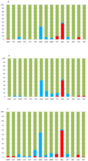 Antibiotic susceptibility of S. Enteritidis strains of the top ten plasmid profile types isolated in regions of (A) Siberia, and (B) the northern and (C) southern Far East of Russia. The Y-axis indicates the percentage of strains susceptible (green), resistant (red), and intermediate (blue) to the given antibiotic. Ampicillin 10 μg (AMP), cephalexin 30 μg (CEF), cefuroxime 30 μg (CXM), cefotaxime 30 μg (CTX), cefepime 30 μg (FEP), streptomycin 10 μg (STR), kanamycin 30 μg (KAN), gentamicin 30 μg (GEN), amikacin 30 μg (AMK), tetracycline 30 μg (TET), nalidixic acid 30 μg (NAL), ciprofloxacin 5 μg (CIP), imipenem 10 μg (IMI), chloramphenicol 30 μg (CHL), and trimethoprim 1.25 μg/sulfamethoxazole 23.75 μg (SXT).