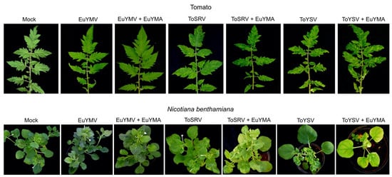 The infectivity, symptom development and viral DNA accumulation of EuYMV, ToSRV and ToYSV were investigated in the presence or absence of EuYMA in tomato, a known host of both ToSRV and ToYSV, and N. benthamiana, a commonly used laboratory host of begomoviruses and known to be a host for the three viruses used.