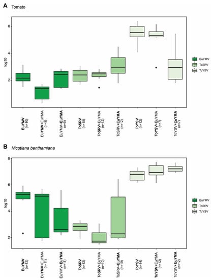 Accumulation of euphorbia yellow mosaic virus (EuYMV), tomato severe rugose virus (ToSRV) and tomato yellow spot virus (ToYSV) DNA-A in the absence or presence of euphorbia yellow mosaic alphasatellite (EuYMA). Absolute quantification of viral DNA was performed at 28 days post-inoculation in (A) tomato (S. lycopersicum) and (B) N. benthamiana. Boxplots correspond to viral accumulation presented as the log of the number of molecules. Dots indicate outlier values. The number of plants analyzed in each treatment (n) is indicated, and the agent (begomovirus or satellite) evaluated is in bold.