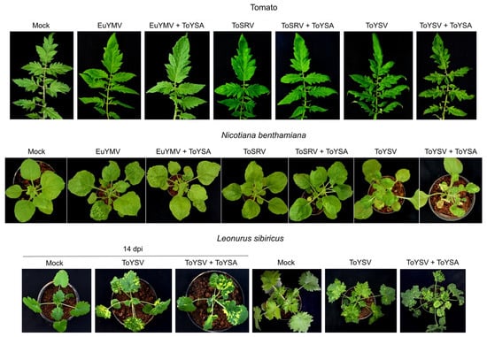To determine whether ToYSA also interacts with EuYMV, ToSRV and ToYSV, the influence of this clecrusatellite on symptoms, infectivity and viral accumulation of the three begomoviruses was evaluated in tomato, N. benthamiana and also in L. sibiricus, the host from which ToYSA was originally isolated in association with ToYSV.
