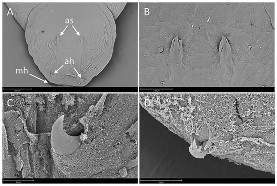 Neobenedenia girellae, SEM micrographs. (A) haptor showing a pair of accessory sclerites (as), a pair of anterior hamuli (ah) and marginal hooklet (mh), scale bar = 300 µm; (B) detail of accessory sclerites, scale bar = 150 µm; (C) detail of anterior hamulus, scale bar = 20 µm; (D) detail of marginal hooklet, scale bar = 15 µm.