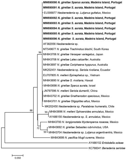 Seven specimens were successfully amplified and sequenced producing 28S amplicons of 1500–1557 bp identical to each other. BLAST search gave the highest identity with Neobenedenia sp. (100% AF382056) and N. girellae (99.8–99.3%) from several fish species in Australia. The p-distance among N. girellae group were 0%, including Neobenedenia sp. (EU306877 and MK202450 []) from Mexico and Chile respectively, but also N. melleni (EU707805 from Vietnam), being most probably misidentified and belonging to N. girellae species. The ML tree showed our specimens forming a well-supported cluster with all N. girellae from several fish species and different geographical origins (Figure 4).