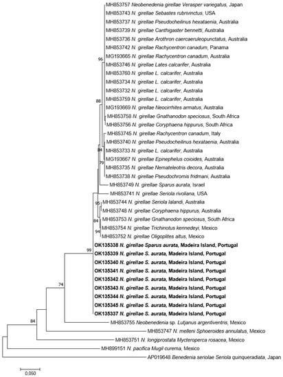 Concerning the cytB, nine specimens were successfully amplified and sequenced (704 bp identical to each other). BLAST analysis gave identities ranging from 98.5% to 97.6% with N. girellae present in GenBank. The p-distance among the N. girellae group were 0.015–0.026. The ML tree showed our specimens included in the N. girellae cluster (Figure 5) named Clade A of Brazenor et al. [] showing the same topology as in the 28S rDNA ML tree.