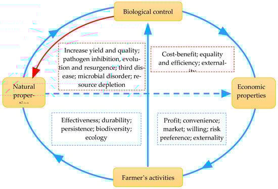 A diagram showing the interconnection of natural and economic properties of farmer adoption for biological control. Biological control of plant diseases can generate multifaced effects, including natural (e.g., pathogen inhibition, evolution, the third-party epidemics, nutrient supply, plant growth support, and resistance against biotic and abiotic stresses, saving yield and quality) and economic (e.g., cost, efficiency, benefit, externality) properties. In turn, these properties, particularly economic profit, convenience, and supply–demand market of technology and products, determine the choice of farmers in using biological control and other agricultural practices through the adaptation of their willingness, risk preferences, and expectations.