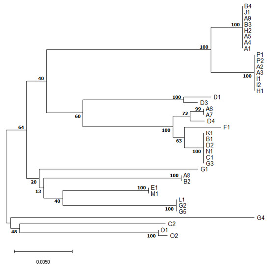 - Saitou, N.; Nei, M. The neighbor-joining method: A new method for reconstructing phylogenetic trees. Mol. Biol. Evol. 1987, 4, 406–425. [Google Scholar] [PubMed]