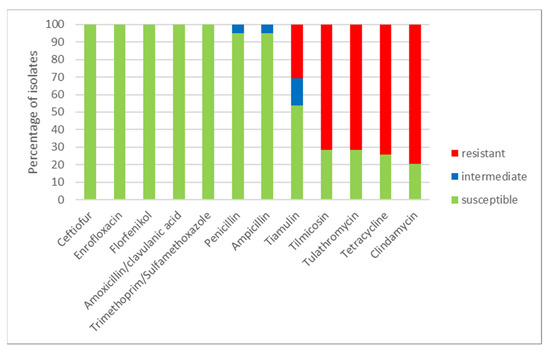The 10 antimicrobials and two combinations of antimicrobials used for AST represented 10 antimicrobial groups: fluoroquinolones, phenicols, lincosamides, pleuromutillins, macrolides, tetracyclines, sulfonamides; the penicillins (narrow spectrum, penicillinase sensitive), penicillins with beta-lactamase inhibitors (amoxicillin with clavulanic acid), and cephalosporins (third generation) were considered as three separate groups.