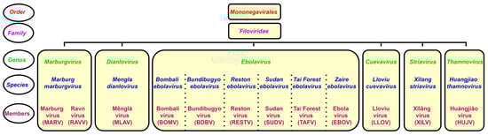 The genus Ebolavirus belongs to the family Filoviridae and consists of six identified species. Schematic taxonomy classification of Filoviridae according to the International Committee on Taxonomy of Viruses (ICTV) is presented in Figure 1 [1,2]. Recently, a new genus, Dianlovirus, has been proposed by Yang and co-workers, including the virus circulating in Chinese bats, named Měnglà virus (MLAV) (Figure 1) [3,4]. According to the current terminology, the Ebola virus (EBOV) is a Zaire ebolavirus species in the Ebolavirus genus. Most of the members of the genus Ebolavirus, except Reston virus (RESTV) and Bombali virus (BOMV), cause severe and frequently fatal hemorrhagic fever in humans and non-human primates (NHPs). In contrast, BOMV infects bats exclusively while RESTV is known to be pathogenic for humanized mice, though no human infection has been detected as yet [1,2,5].
