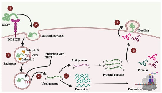 A simple diagrammatic representation of various steps in the EBOV life cycle. 1. Attachment—EBOV can interact with different host cell receptors, and none of the receptors is indispensable for attachment. In the Figure, DC-SIGN receptor is shown as an example. 2. Uptake—Uptake mainly occurs by micropinocytosis, as shown, though other methods such as clathrin-mediated endocytosis and caveolin-mediated endocytosis are also contemplated. 3. Entry—GP1 proteolysis inside endosome enables viral interaction with obligate host receptor cholesterol transporter Niemann-Pick C1 (NPC1; shown in red color). 4. Release—After membrane fusion, the viral genome is released in the host cell cytoplasm. 5. Transcription and Replication—Primary transcription occurs in the host cell cytoplasm followed by a translation. Antigenome is used as a template for synthesis of progeny genomes. 6. Transport—Various proteins are transported near the plasma membrane. 7. Assembly and Budding—VP40 plays a crucial role in assembly, virus-like particle (VLP) formation and budding.